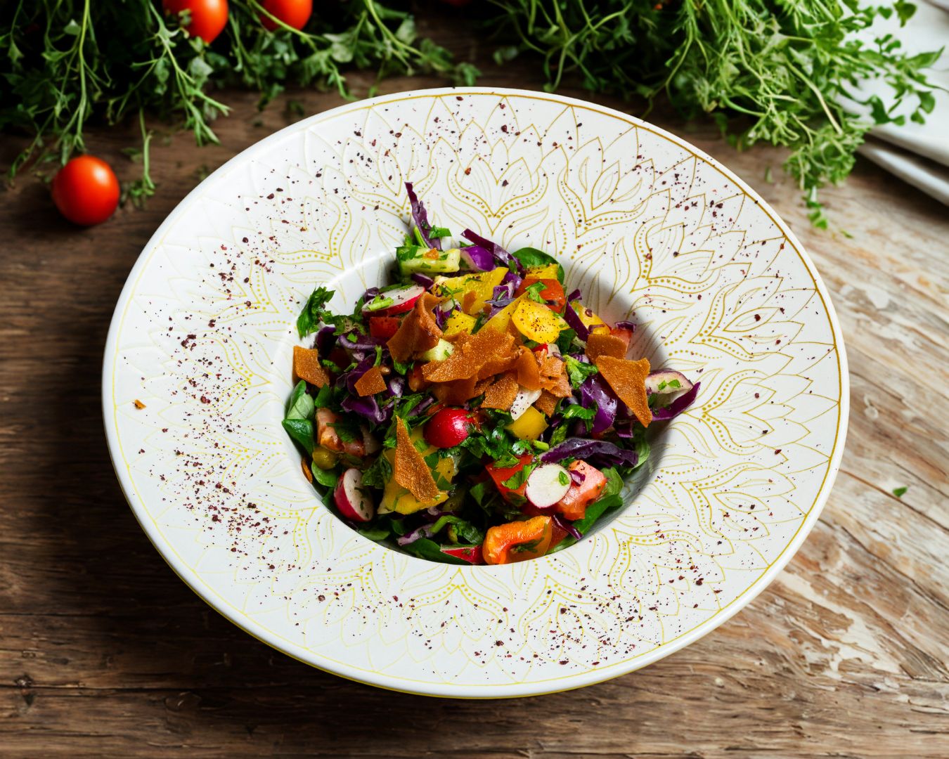 Labné, salade, oignons, cornichon, persil, sauce à l'ail